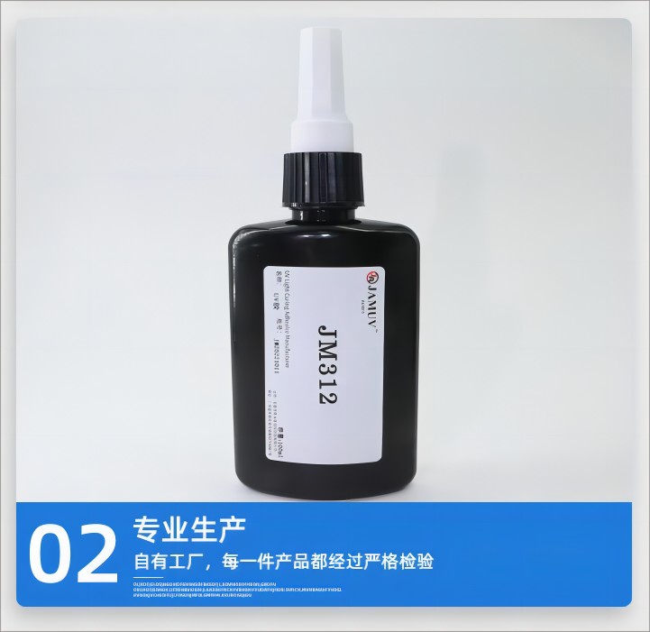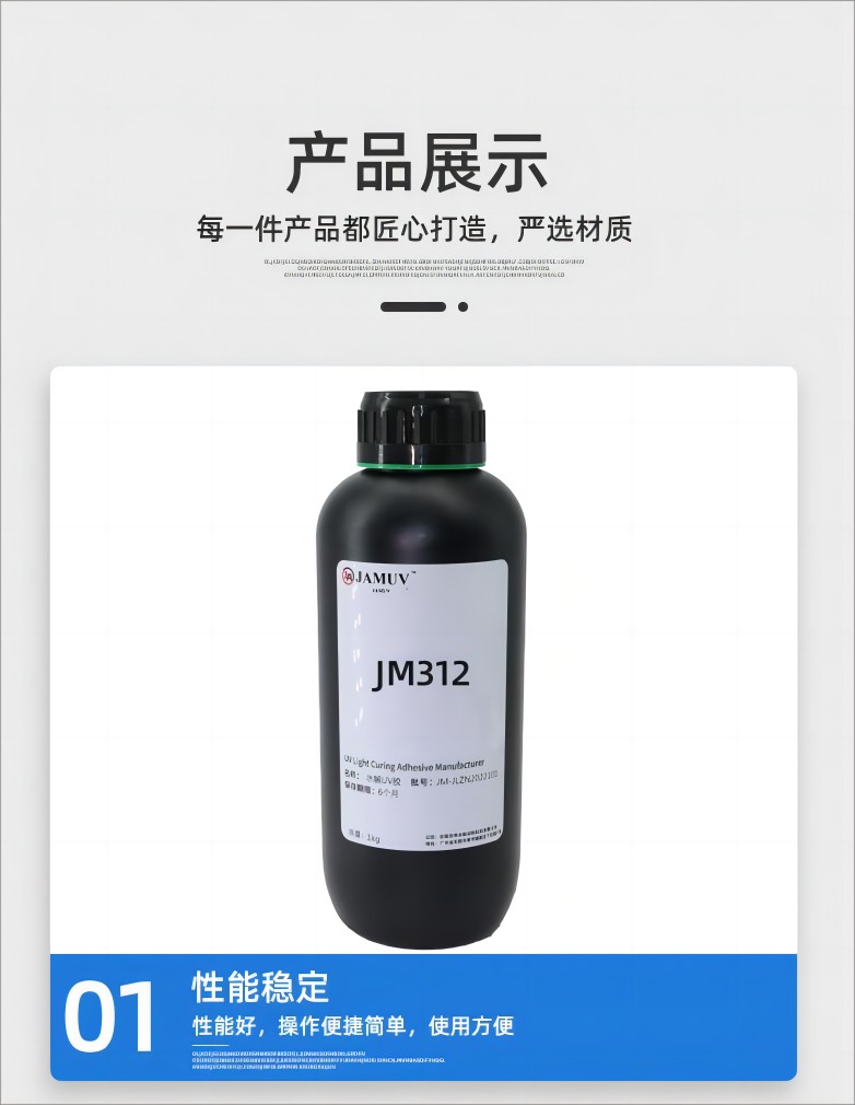 产品介绍 JM312是一款单组份,通过紫外线光照射固化的UV胶,操作简单、快速固化、粘接力好、柔韧性好, 对塑料PMMA、PC、PS,PVC等塑料材料及热塑弹性体TPU类材料具有优异的粘接力。 使用方法: 1.选择于室内无尘的环境下操作,将粘接材料表面清洁干净; 2.将JM312涂胶于材料表面,再放粘接材料; 3.用波长为365-395nm的光源进行照射固化,固化能量达到800-1200mj/cm²即可完成固化; 4.待表面温度冷却后可进行初步性能测试,完全固化性能需等待24H后进行。