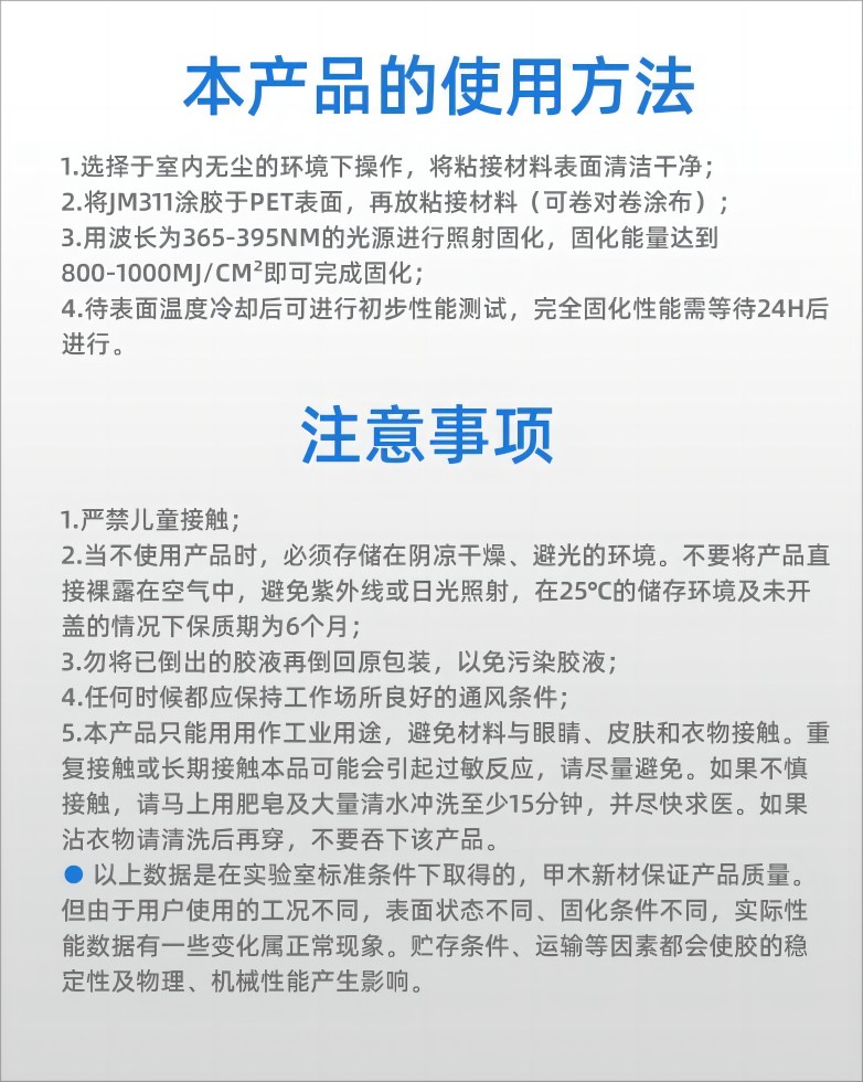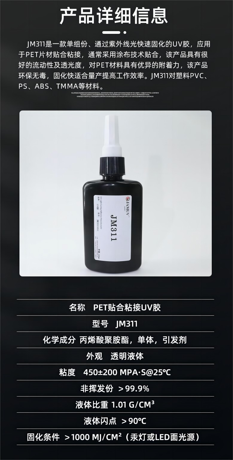 产品介绍 JM311是一款单组份、通过紫外线光快速固化的UV胶,应用于PET片材贴合粘接,通常采用涂布技术贴合,该产品具有很好的流动性及透光度,对PET材料具有优异的附着力,该产品环保无毒,固化快适合量产提高工作效率。JM311对塑料PVC、PS、ABS、TMMA等材料具有优异的附着力。 使用方法: 1.选择于室内无尘的环境下操作,将粘接材料表面清洁干净; 2.将JM311涂胶于PET表面,再放粘接材料(可卷对卷涂布); 3.用波长为365-395nm的光源进行照射固化,固化能量达到800-1000mj/cm²即可完成固化; 4.待表面温度冷却后可进行初步性能测试,完全固化性能需等待24H后进行。