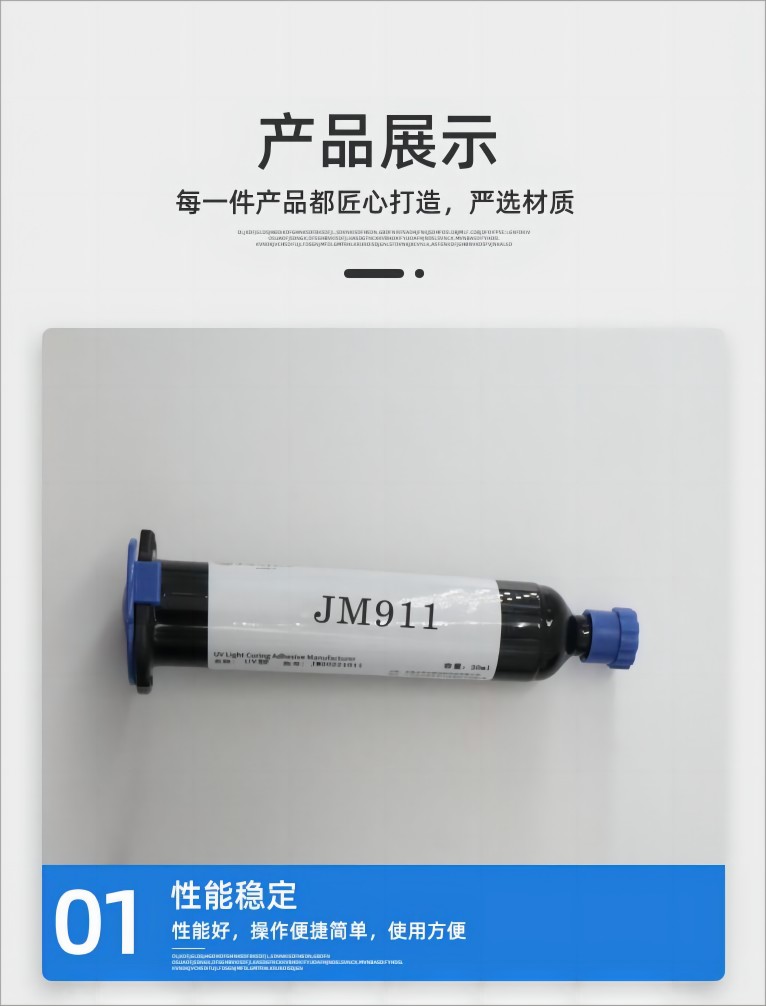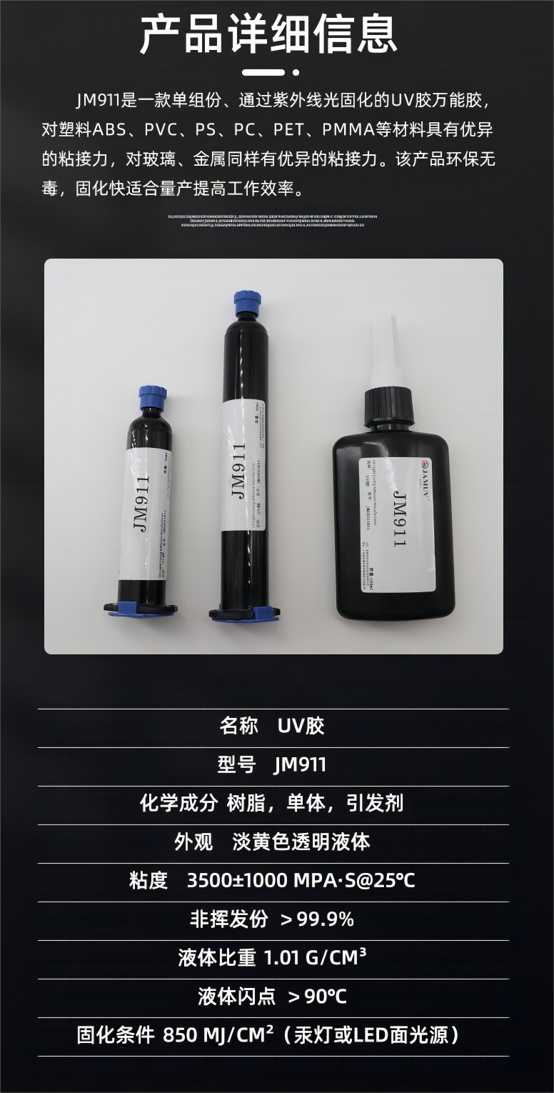 产品介绍 JM911是一款单组份、通过紫外线光固化的UV胶**胶,对塑料ABS、PVC、PS、PC、PET、PMMA等材料具有优异的粘接力,对玻璃、金属同样有优异的粘接力。该产品环保无毒,固化快适合量产提高工作效率。 使用方法: 1.选择于室内无尘的环境下操作,将粘接材料表面清洁干净; 2.将JM911点胶于粘接部位,再粘上需要粘接的材料; 3.用紫外线光源进行照射固化,固化能量达到1000mj/cm²即可完成固化; 4.待表面温度冷却后可进行初步性能测试,完全固化性能需等待24H后进行。