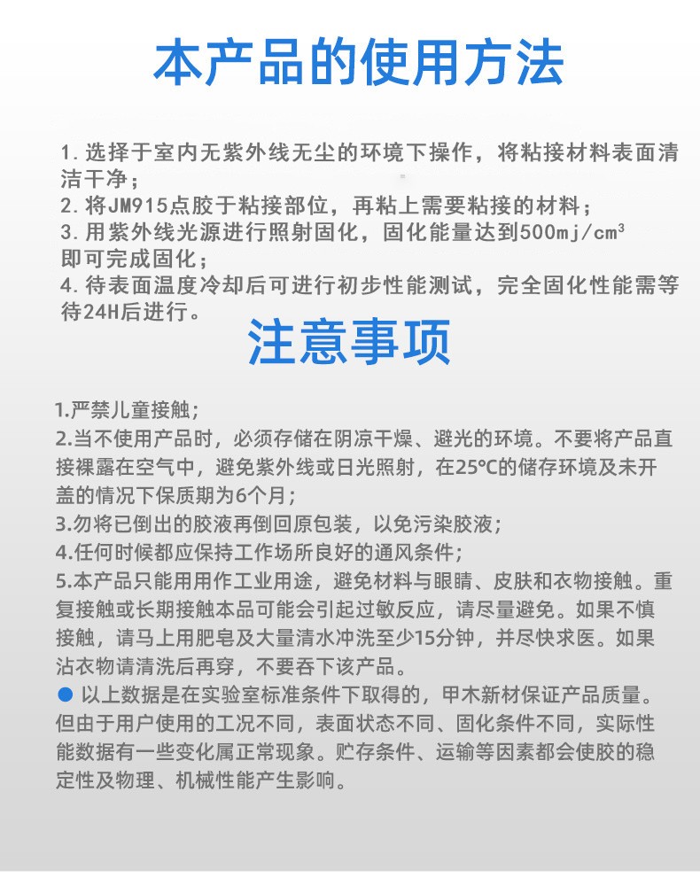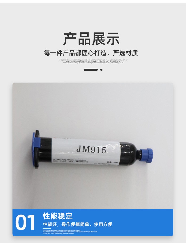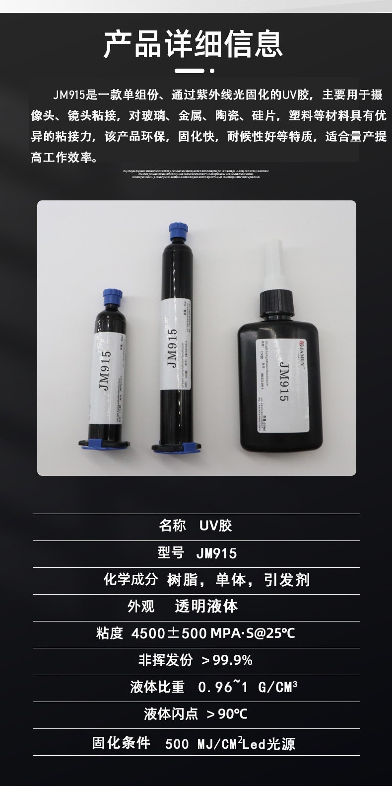 产品介绍 JM915是一款单组份、通过紫外线光固化的UV胶,主要用于摄像头、镜头粘接,对玻璃、金属、陶瓷、硅片,塑料等材料具有优异的粘接力,该产品环保,固化快,耐候性好等特质,适合量产提高工作效率。