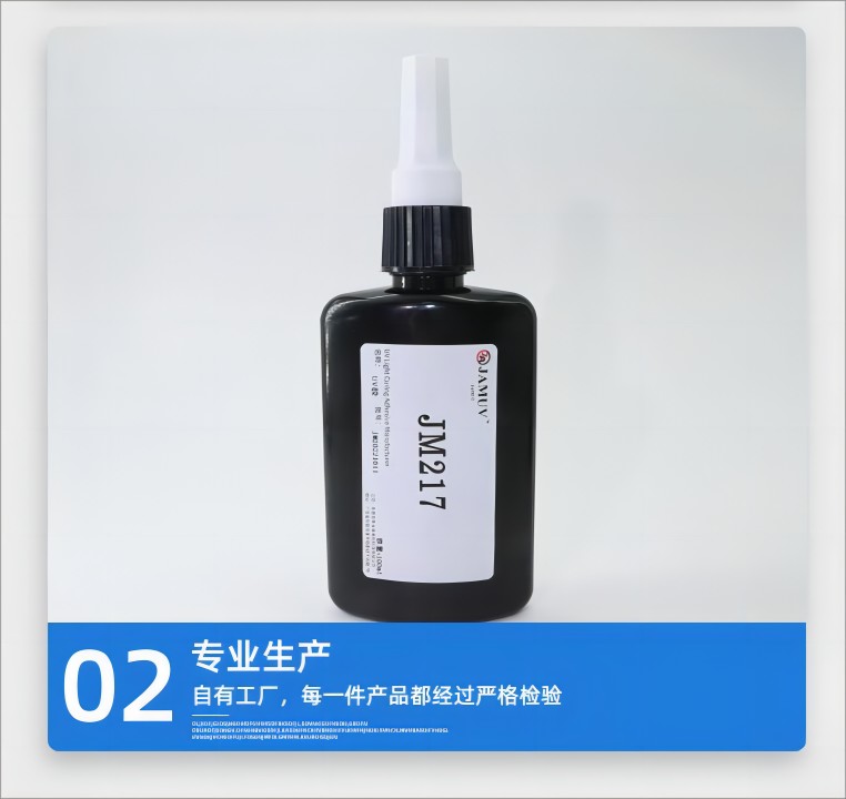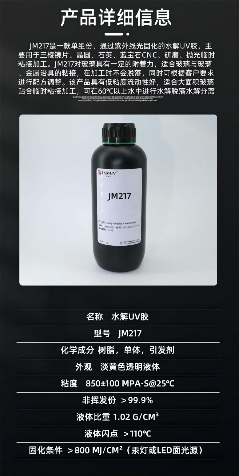 产品介绍 产品介绍:JM217是一款单组份、通过紫外线光固化的水解UV胶,主要用于三棱镜片、晶圆、石英、蓝宝石CNC、研磨、抛光临时粘接加工。JM217对玻璃具有一定的附着力,适合玻璃与玻璃、金属治具的粘接,在加工时不会脱落,同时可根据客户要求进行配方调整。该产品具有低粘度流动性好,适合大面积玻璃贴合临时粘接加工,可在60℃以上水中进行水解脱落水解分离......