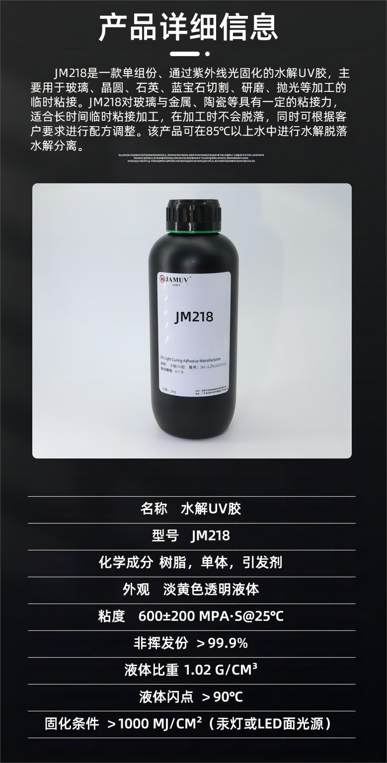 产品介绍 产品介绍: 这款水解胶水对玻璃与金属、陶瓷等具有一定的粘接力,适合长时间临时粘接加工,在加工时不会脱落,同时可根据客户要求进行配方调整。 JM218是一款单组份、通过紫外线光固化的水解UV胶,主要用于玻璃、晶圆、石英、蓝宝石切割、研磨、抛光等加工的临时粘接。该产品可在85℃以上水中进行水解脱落水解分离。