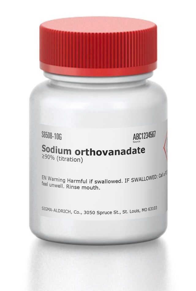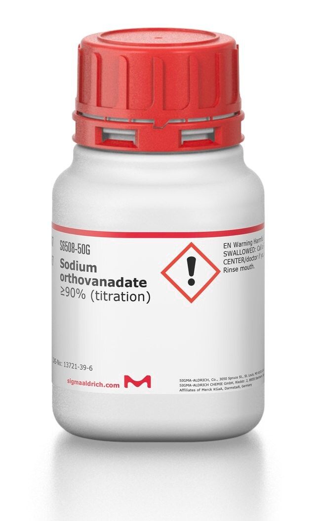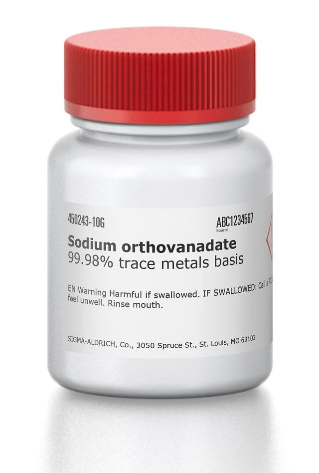 | 应用 | Inhibitor of protein tyrosine phosphatase and alkaline phosphate Sodium orthovanadate is used in protein analysis in molecular biology and acts as an inhibitor of protein tyrosine phosphatases, alkaline phosphatases and kinases. It is also used to prepare the stop solution in dephosphorylation assay of insulin receptor kinase. It serves as a reagent in the development of matrix Chip that utilizes surface-immobilized antibodies. Further, it is utilized for the preservation of protein tyrosyl phosphorylation state in cells and cell lysates. |