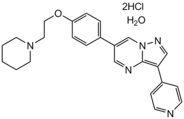 | Biochem/physiol Actions【生化/生理作用】 | Dorsomorphin是骨形态生成蛋白(BMP)信号传导的选择性抑制剂。已有研究发现它能够抑制胚胎形成所需的BMP信号,并显著促进人多能干细胞(hPSC)的神经分化。 Dorsomorphin还可作为AMPK(AMP活化蛋白激酶)的有效的、选择性、可逆性和ATP竞争性抑制剂;当存在5 μM的ATP且不存在AMP时,Ki = 109 nM)。 |